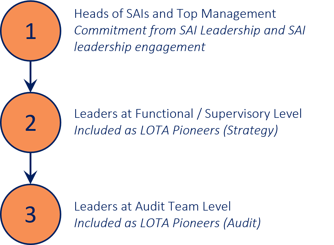 To begin with this initiative will be offered in English for up to 25 SAIs. Each SAI is requested to nominate two persons from different leadership levels in the SAI. While one will act as LOTA Pioneer (Strategy), the other will act as LOTA Pioneer (Audit).