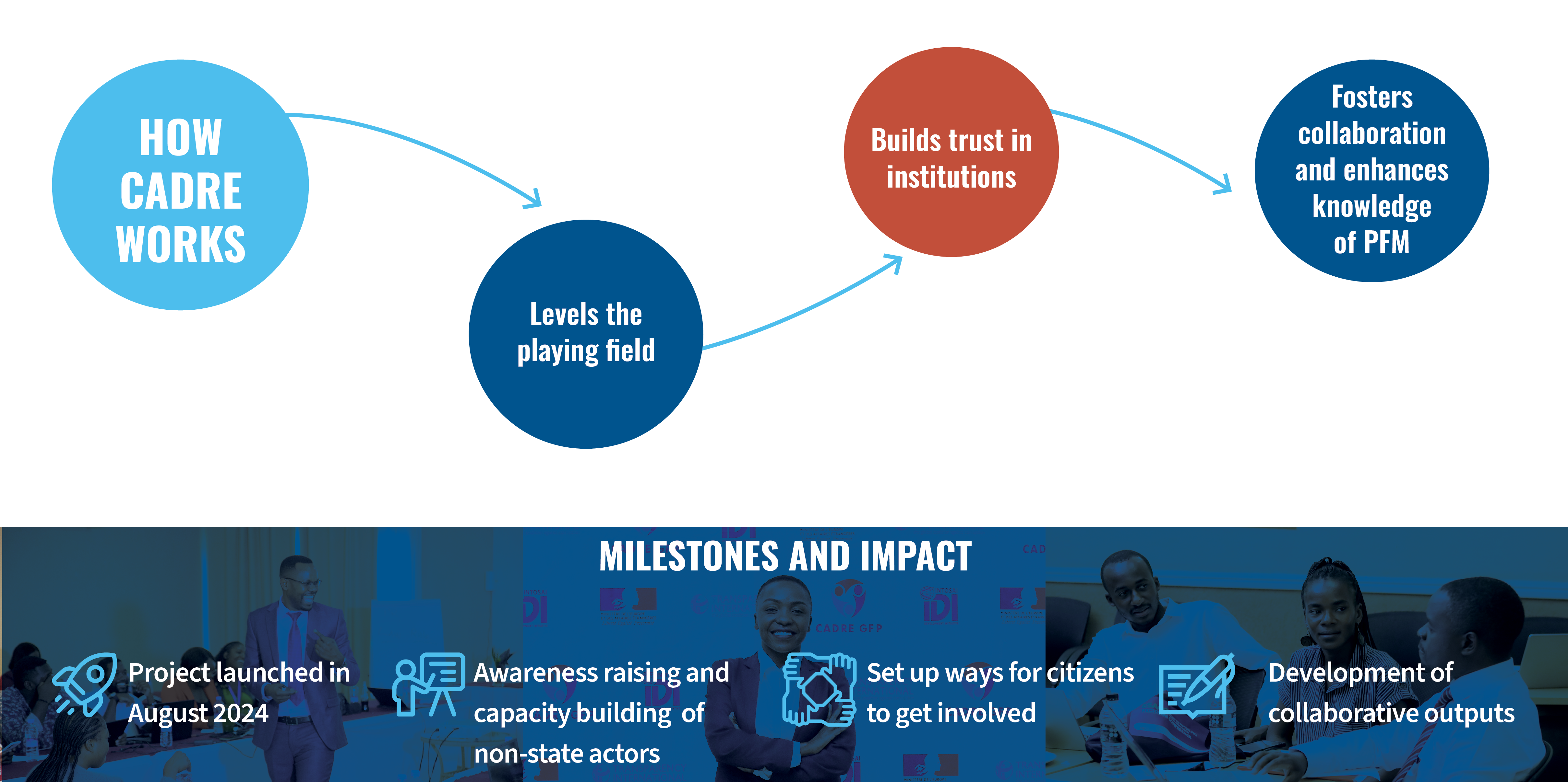 These initiatives aim to strengthen the influence of accountability actors on national PFM reforms and promote greater transparency and accountability in the management of public resources. By deepening partnerships and enhancing the skills of local actors, the CADRE Project seeks to drive sustainable change in governance frameworks across participating countries and beyond.